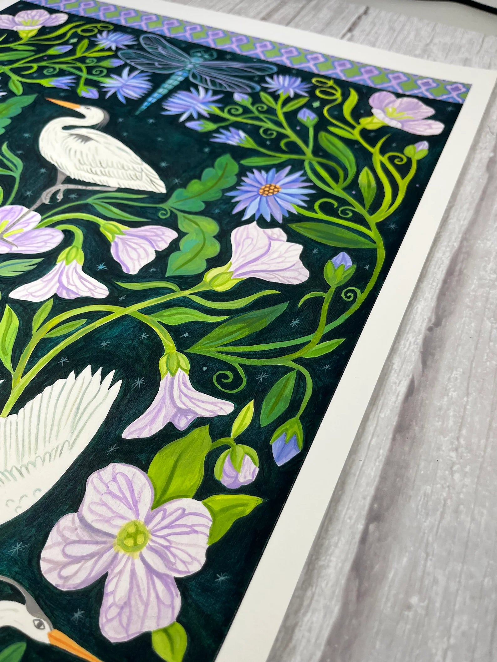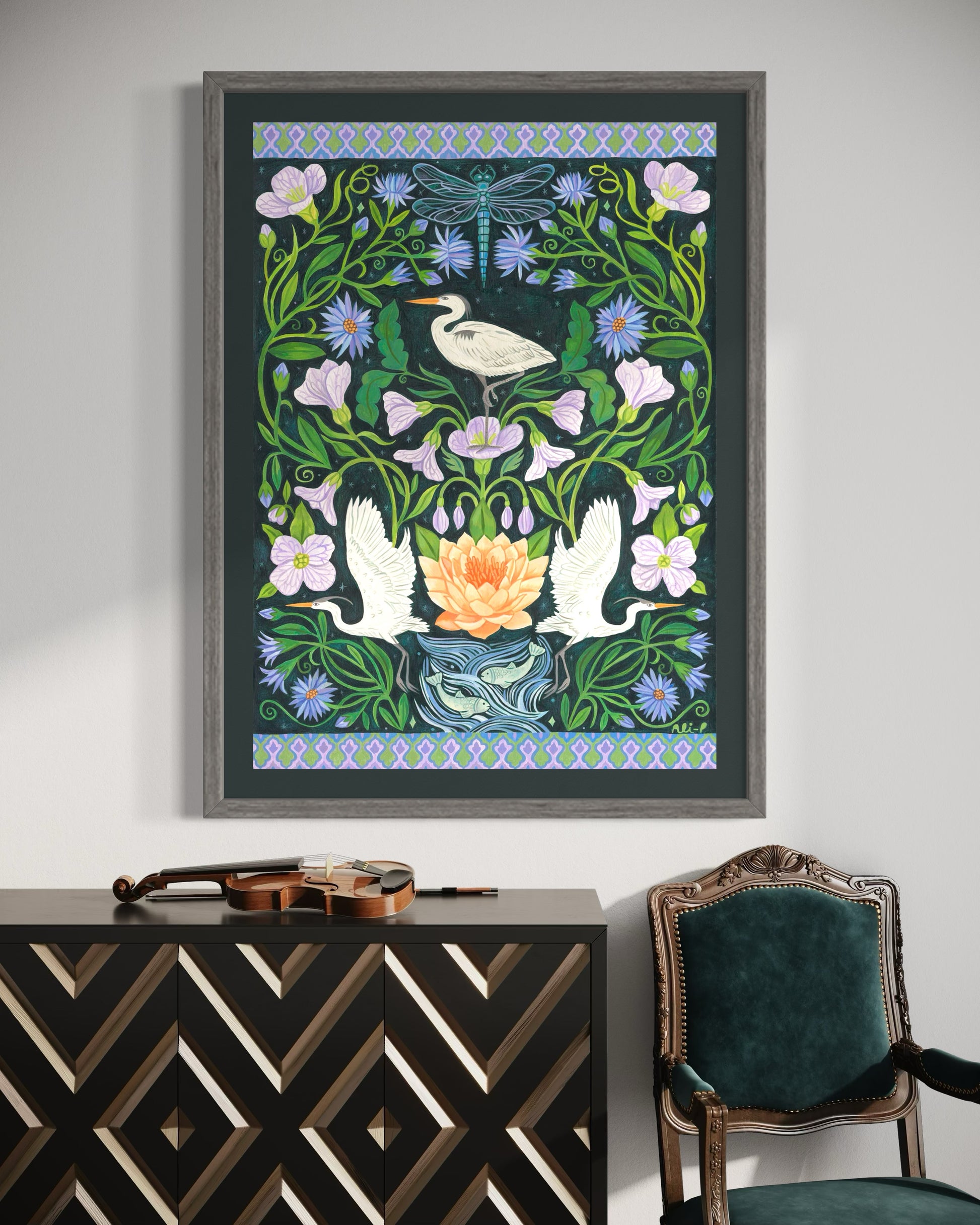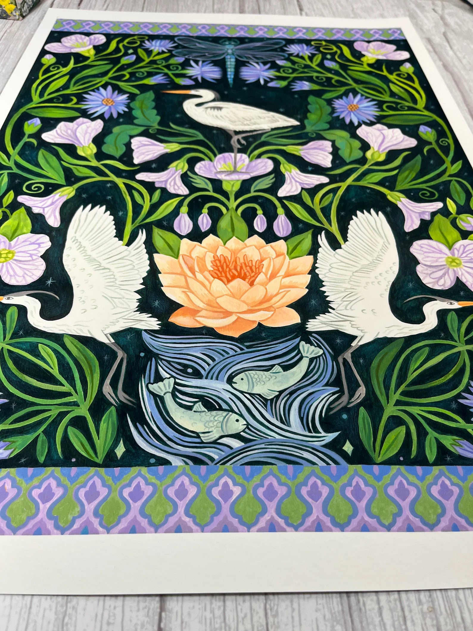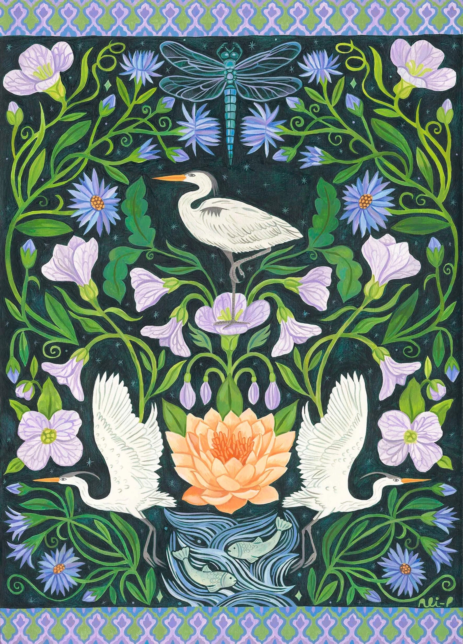 Inspired by Ali's deep connection to the landscapes and wildlife of Northern Ireland, this beautifully detailed print reflects the birds, plants, and waterways she sees on her walks. It features herons, a dragonfly, a lotus flower, and fish, surrounded by local wildflowers.
