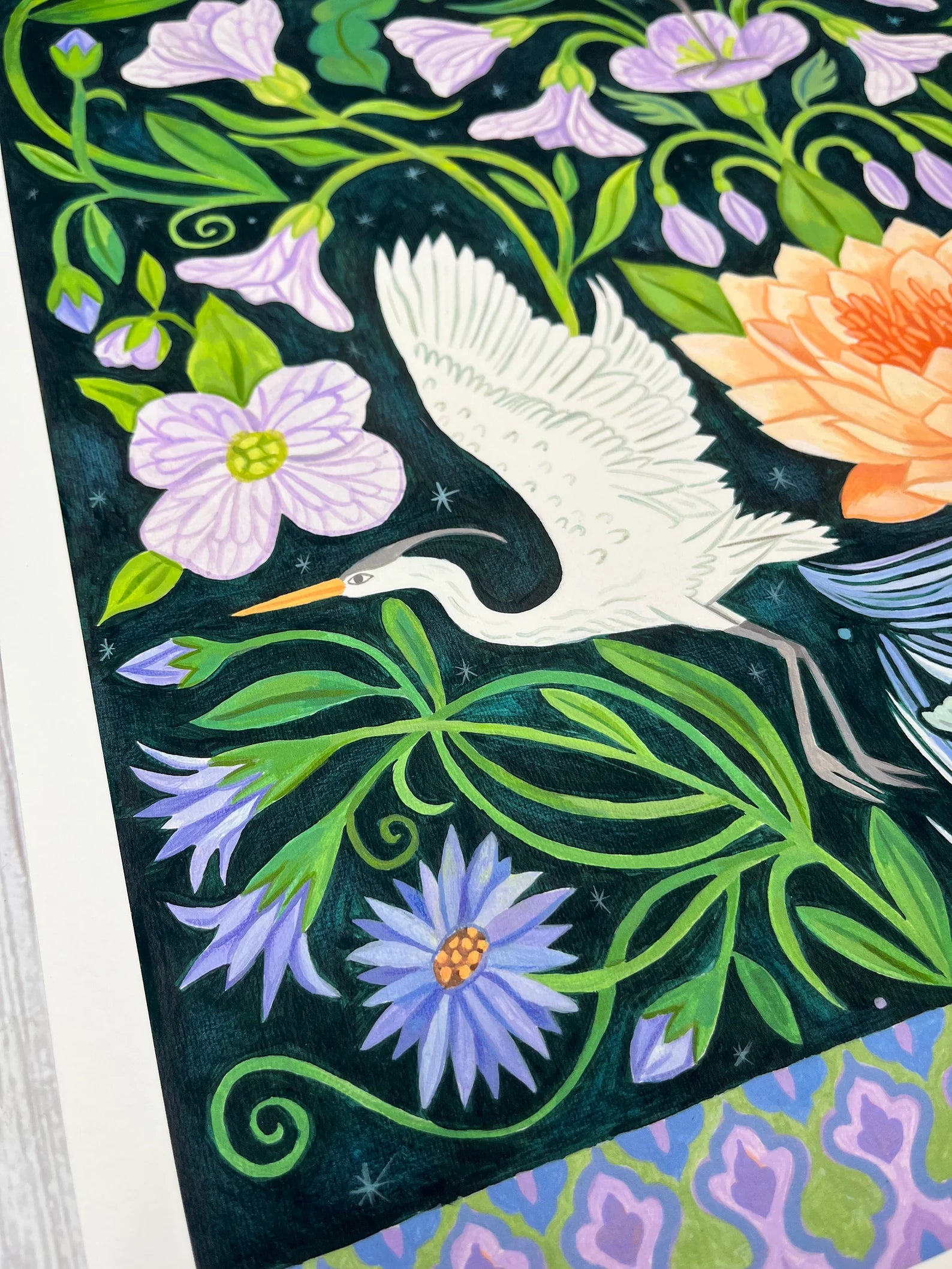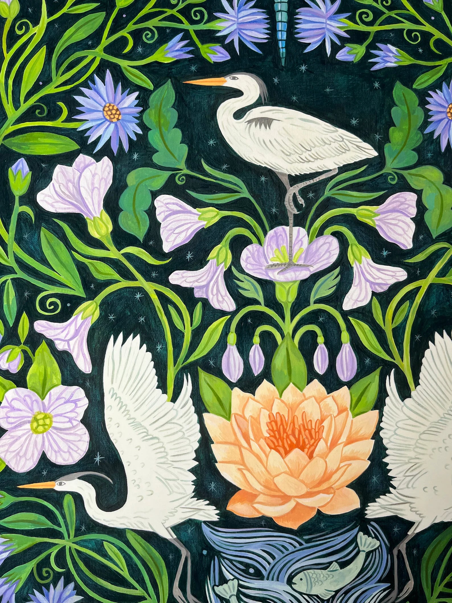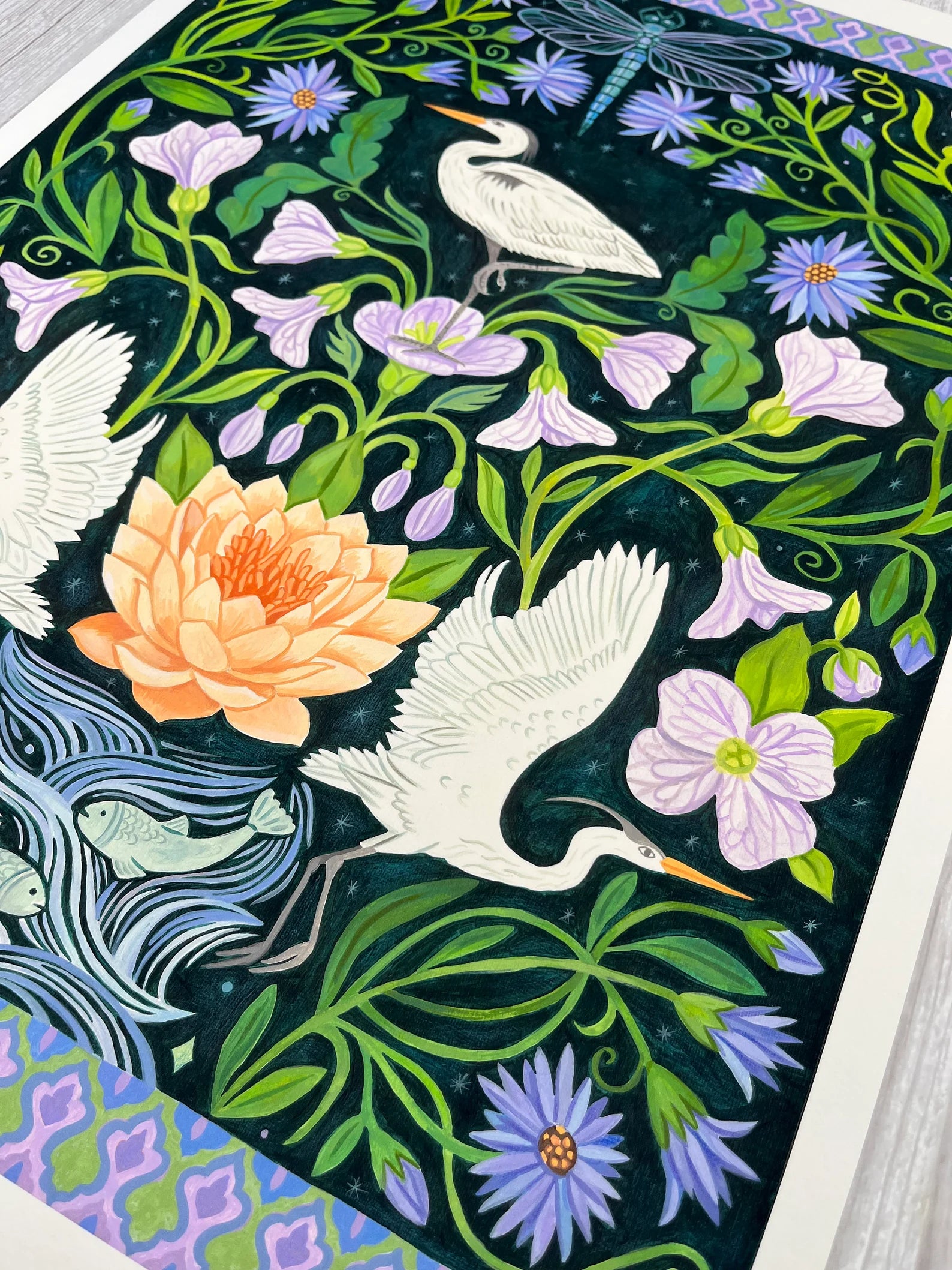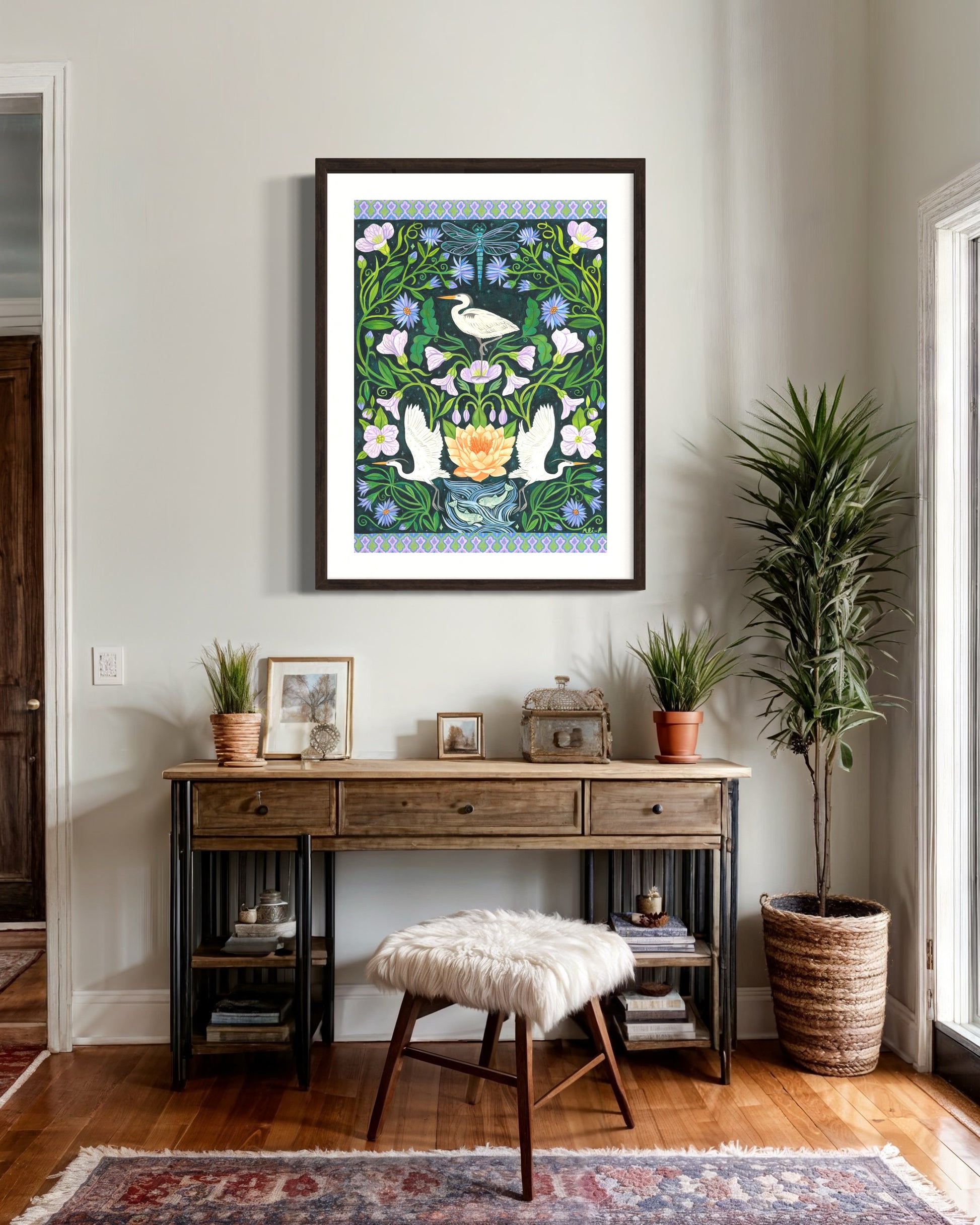 Inspired by Ali's deep connection to the landscapes and wildlife of Northern Ireland, this beautifully detailed print reflects the birds, plants, and waterways she sees on her walks. It features herons, a dragonfly, a lotus flower, and fish, surrounded by local wildflowers.