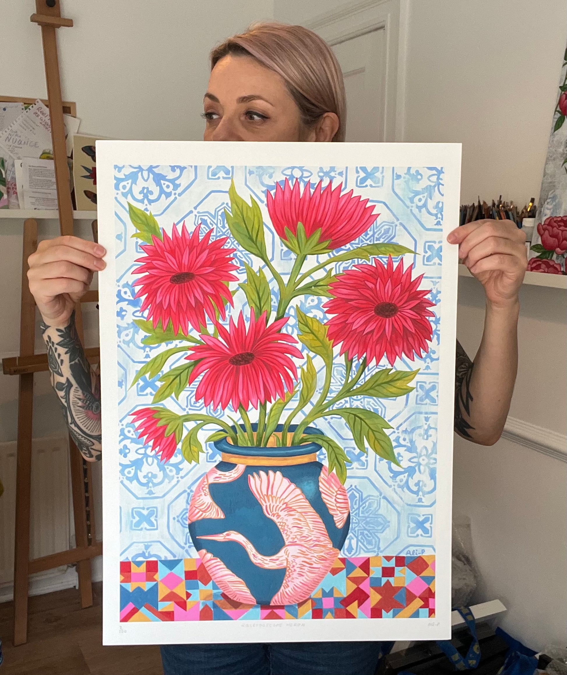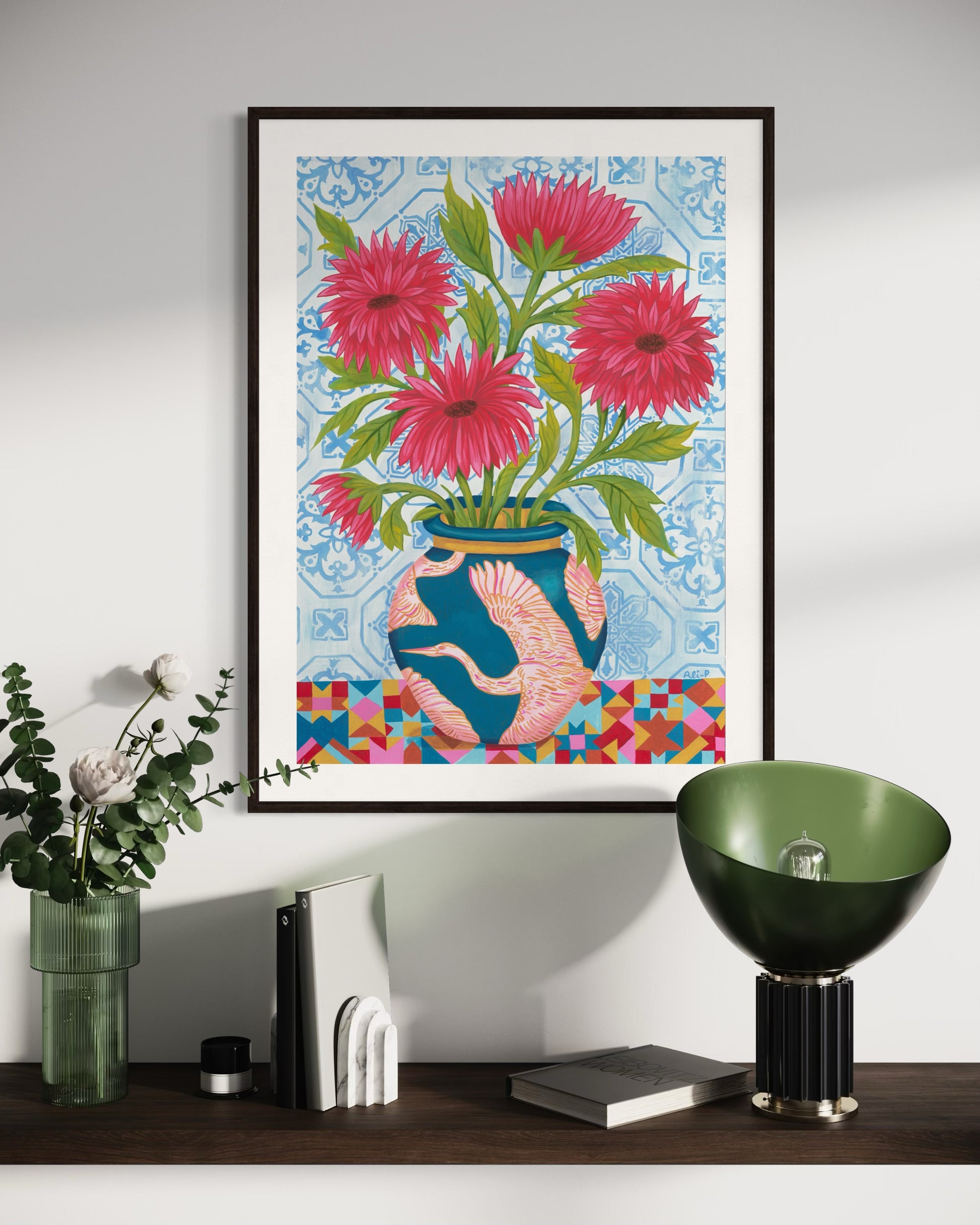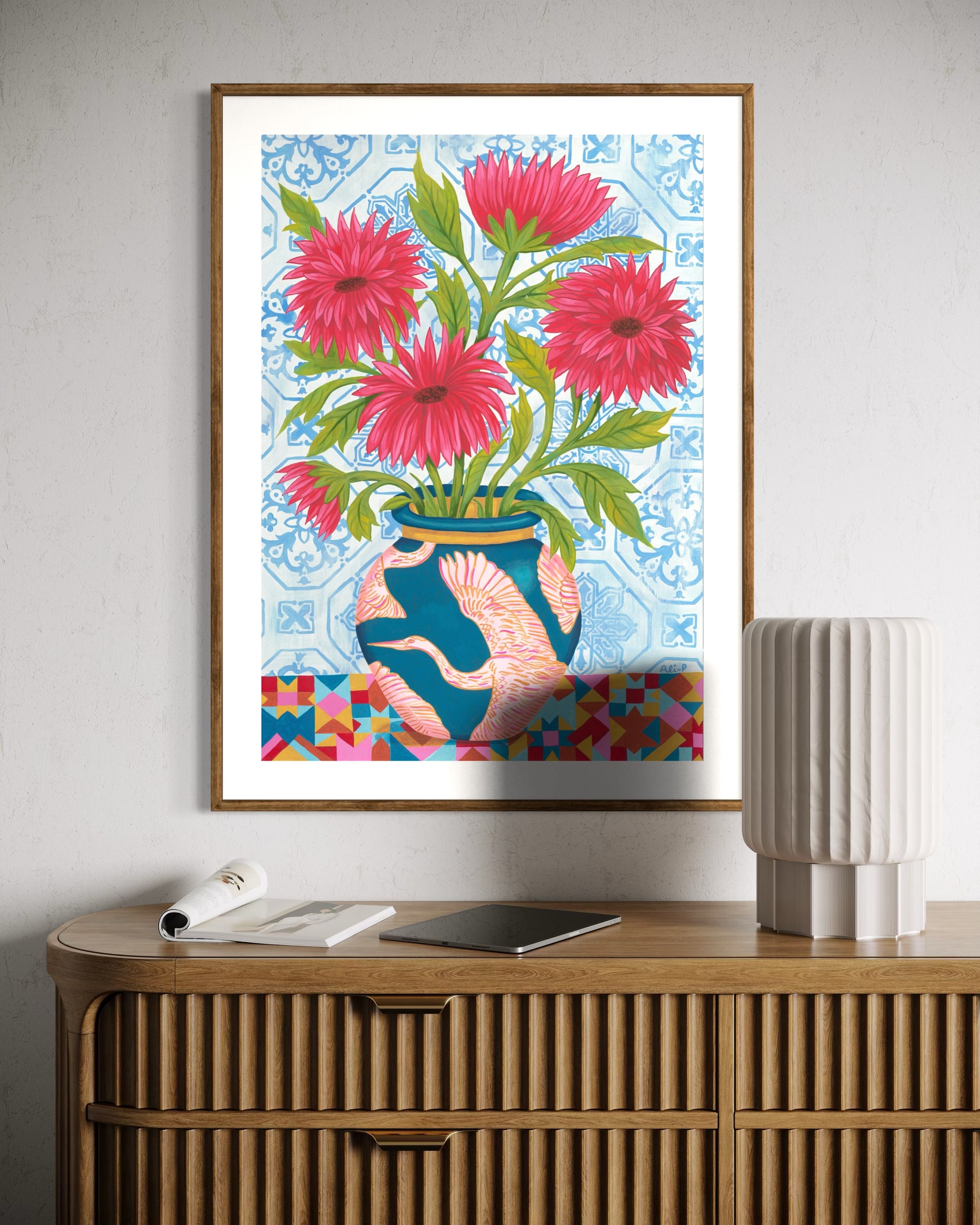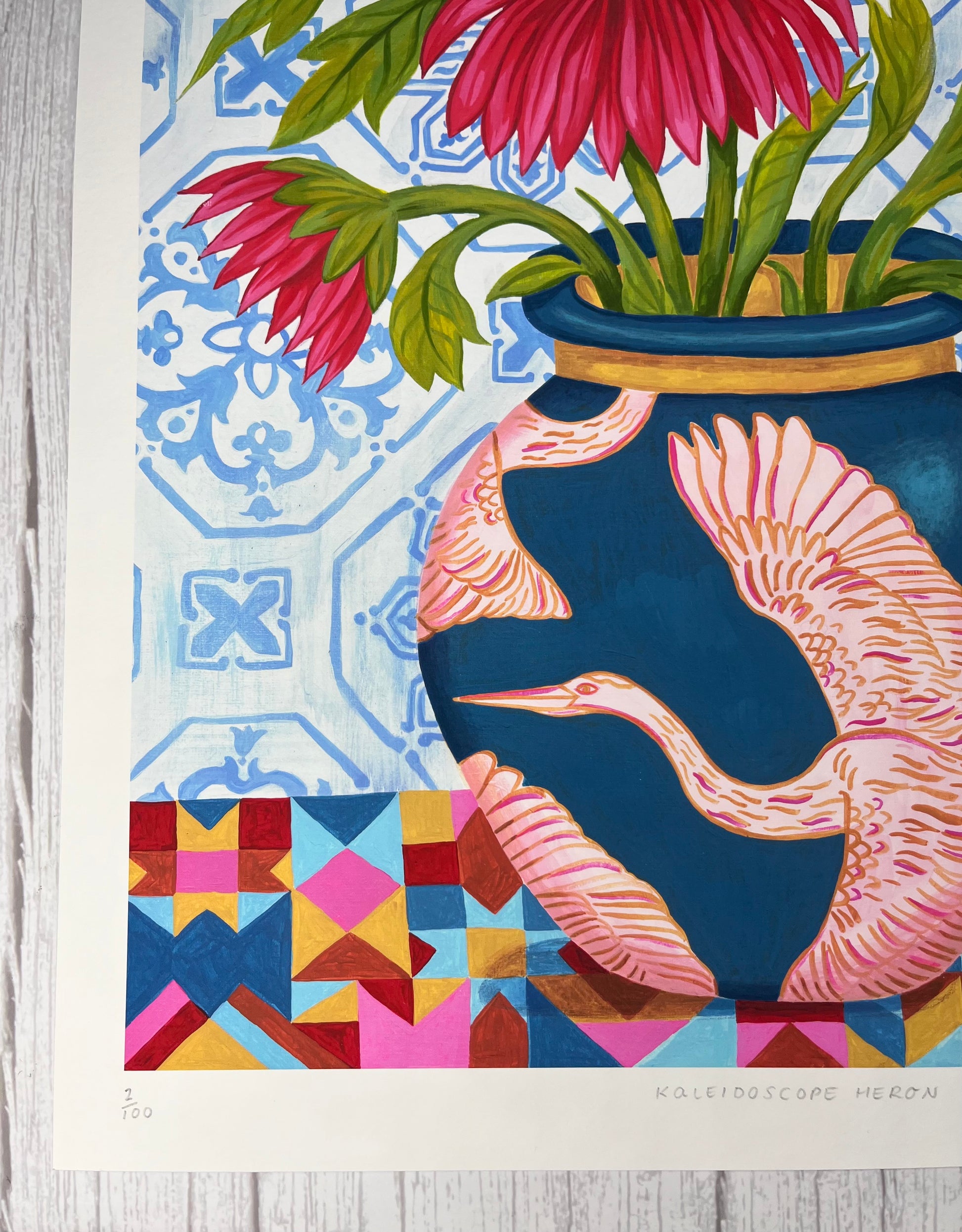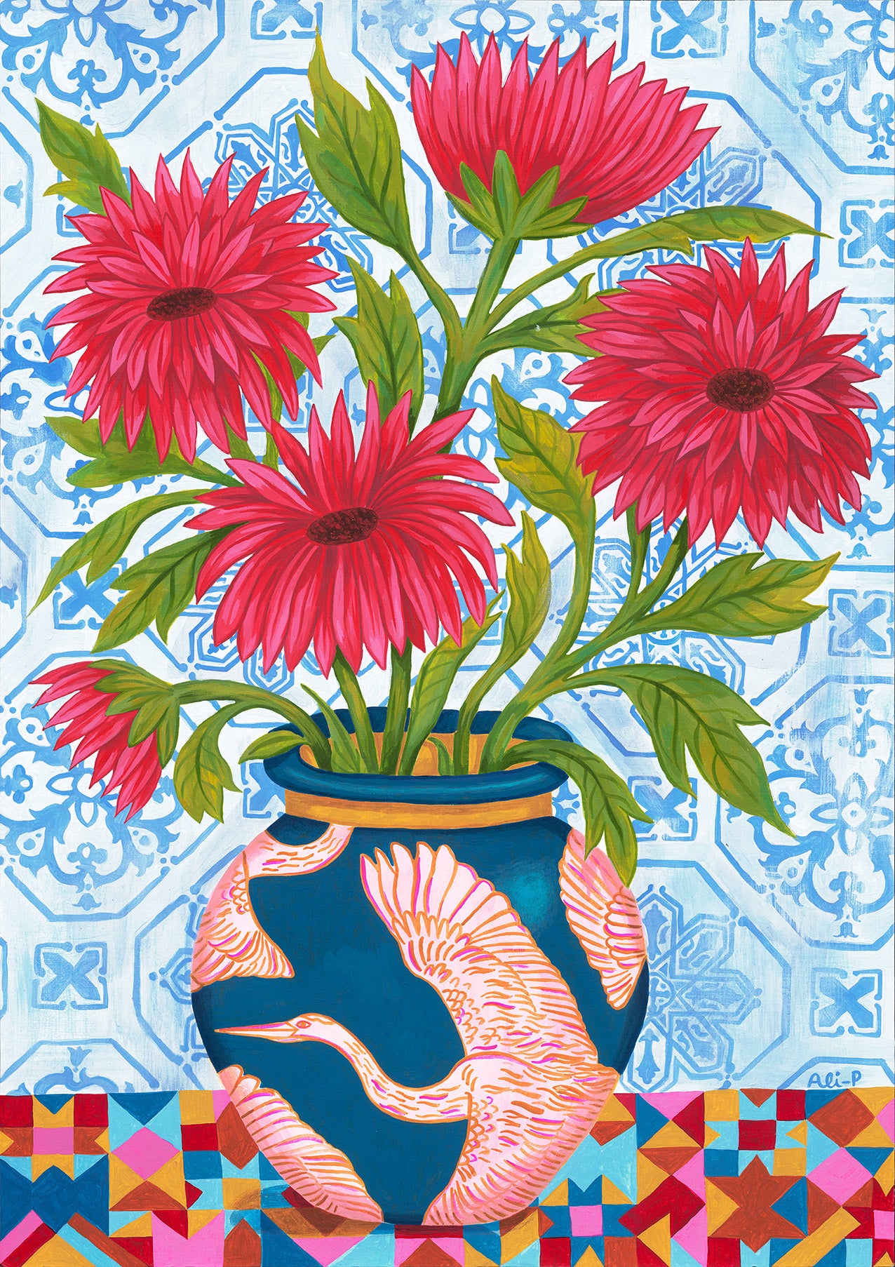 Kaleidoscope Heron is inspired by the beautiful azulejo tiles Ali fell in love with in Lisbon, combined with her love of birds. The bold patterns and vibrant colours bring together a pink heron design on a deep blue vase, bright red flowers, and a mix of geometric and floral backgrounds.