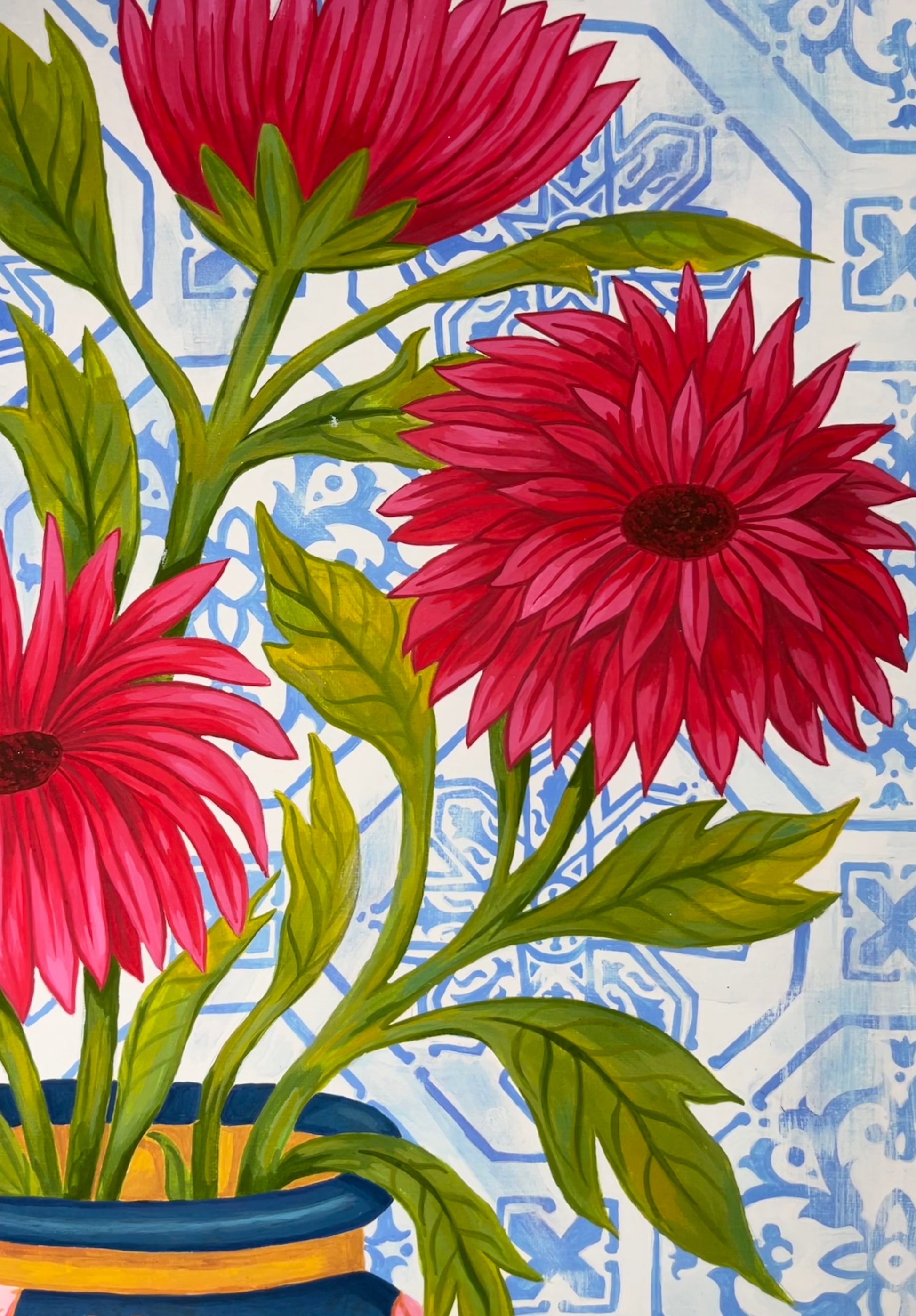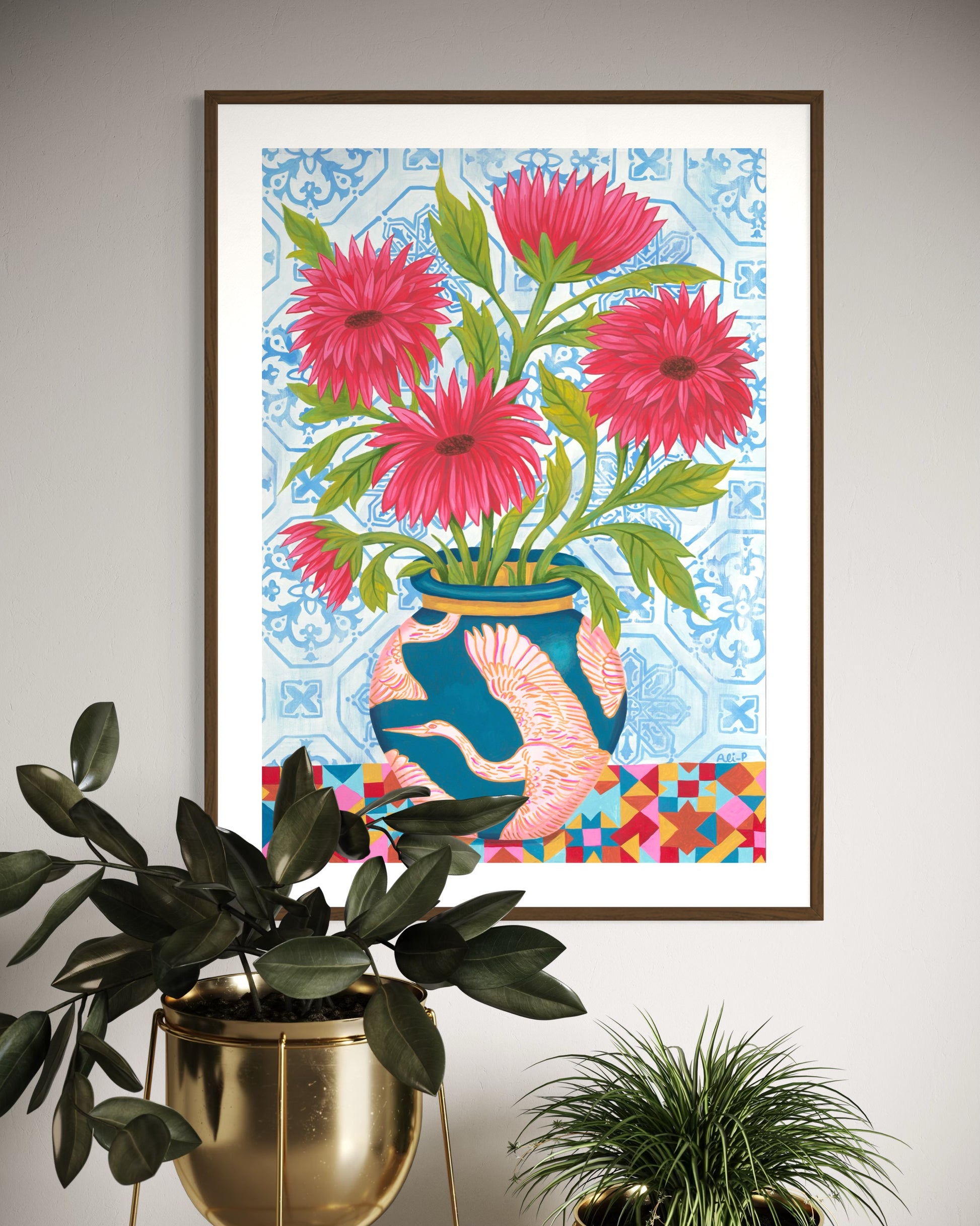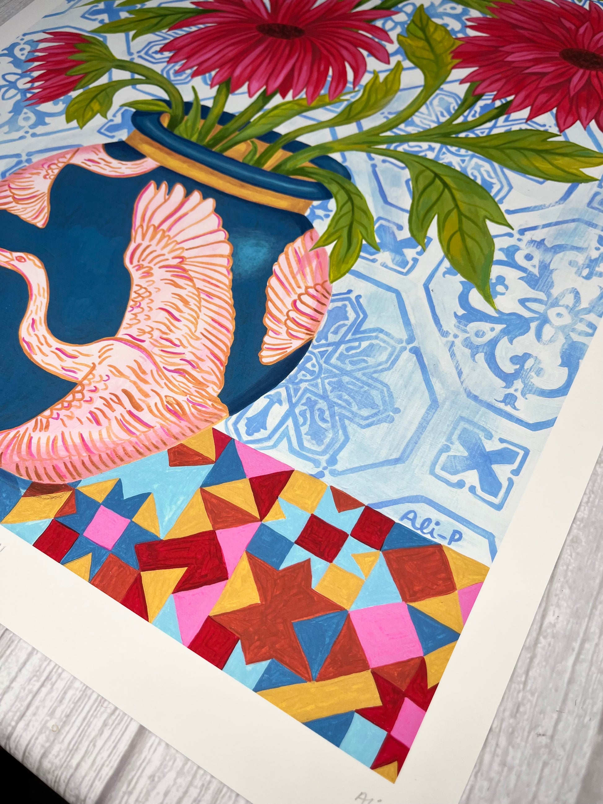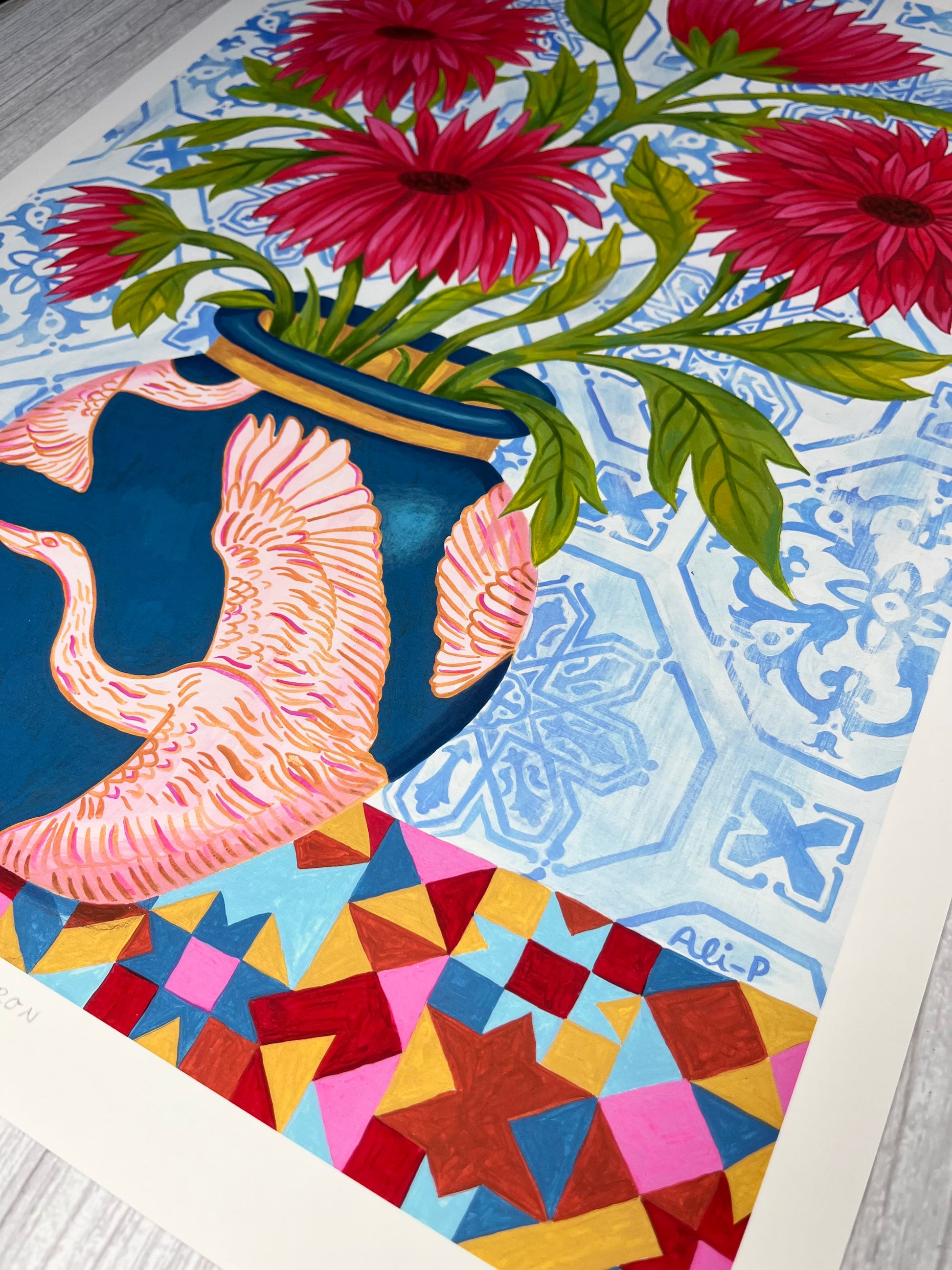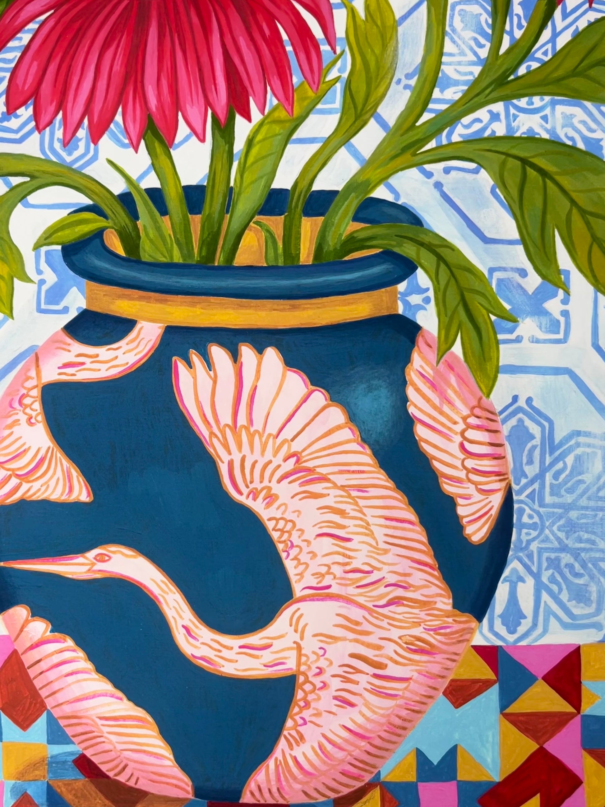 Kaleidoscope Heron is inspired by the beautiful azulejo tiles Ali fell in love with in Lisbon, combined with her love of birds. The bold patterns and vibrant colours bring together a pink heron design on a deep blue vase, bright red flowers, and a mix of geometric and floral backgrounds.