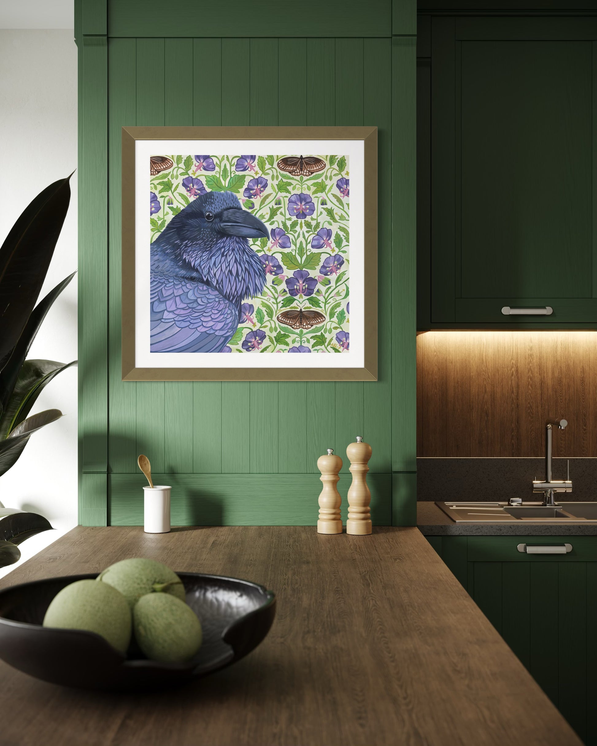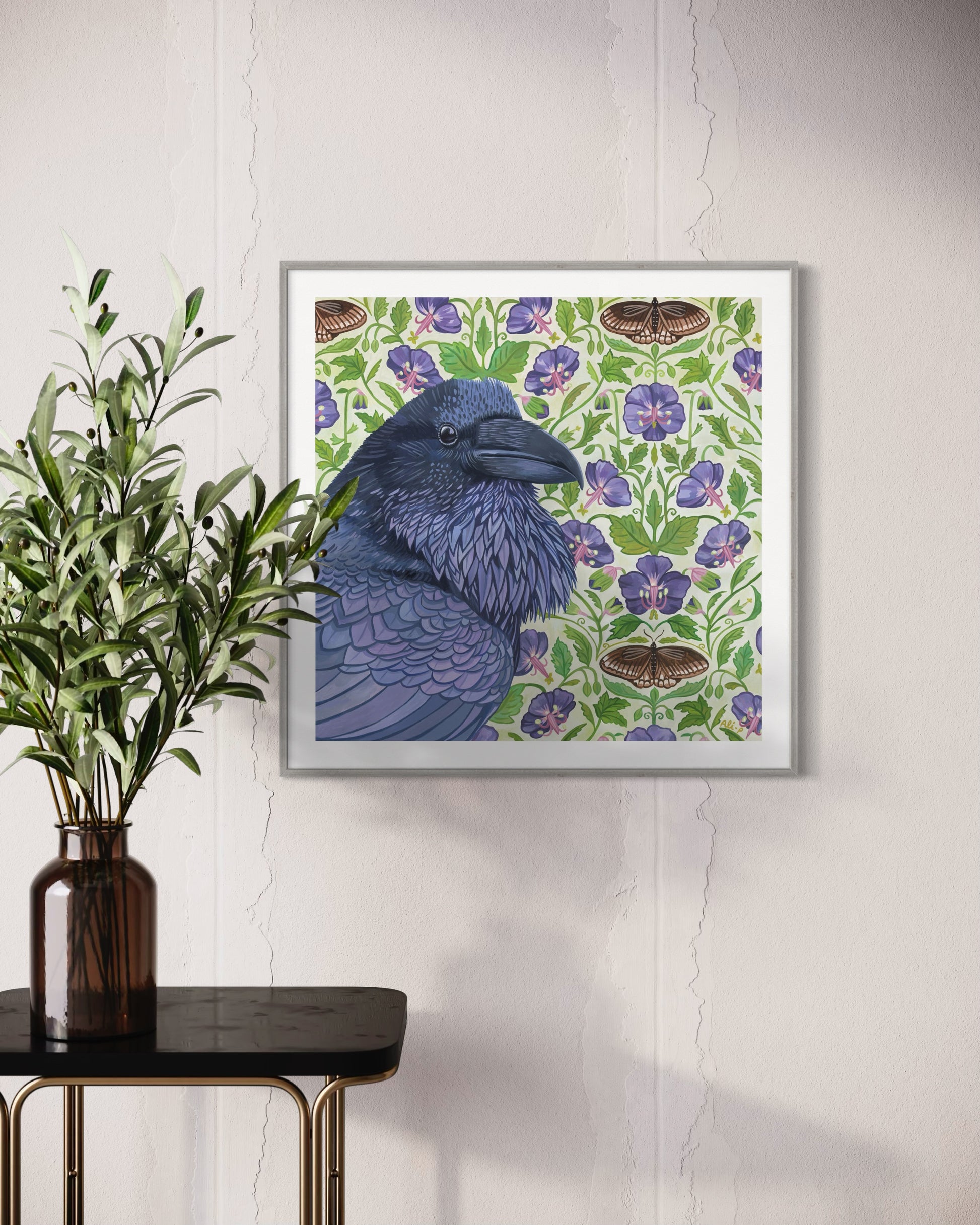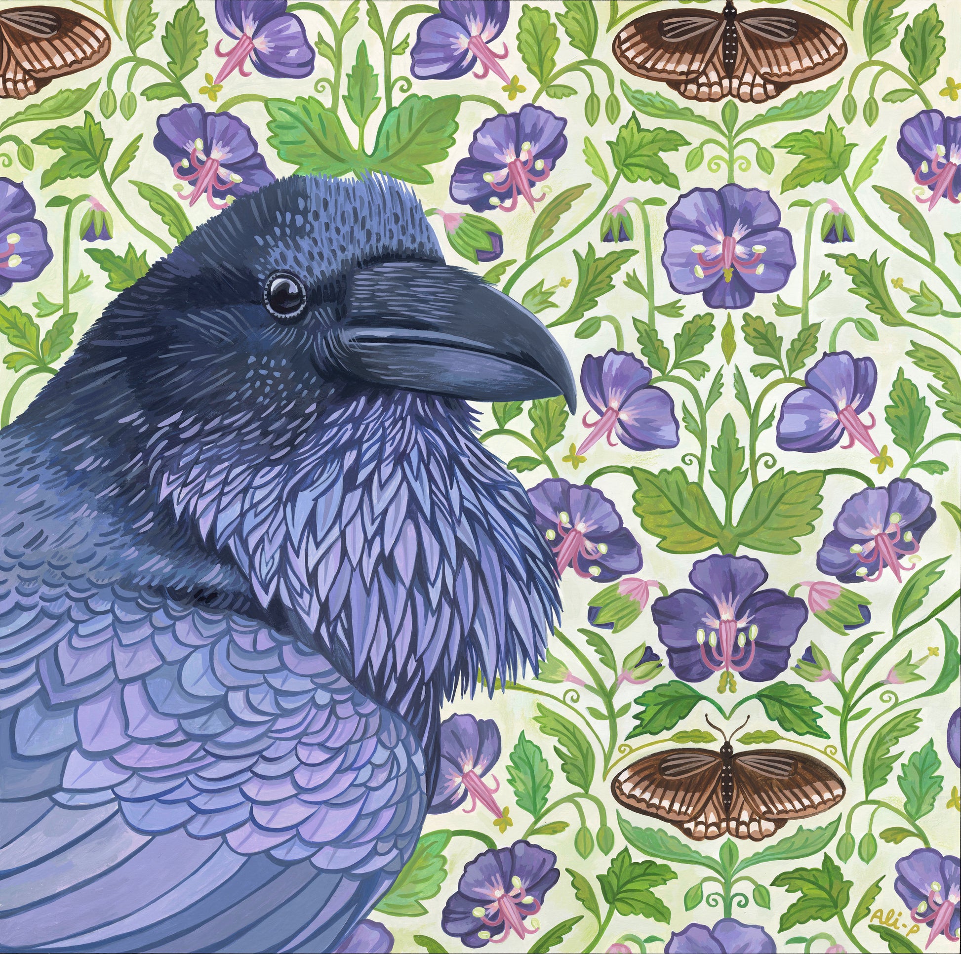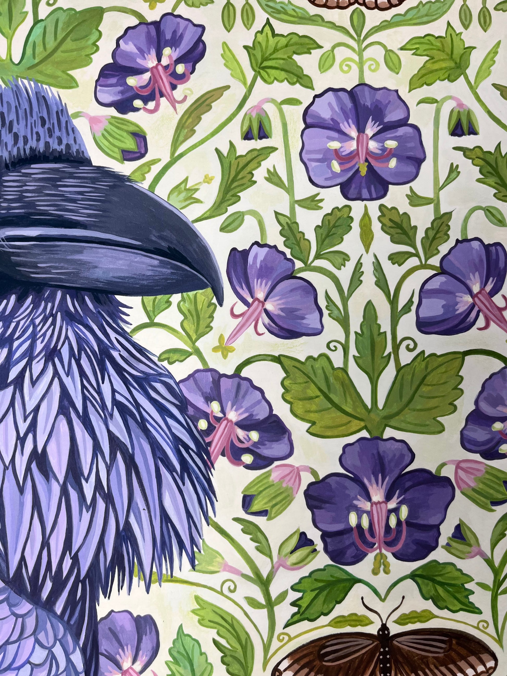 Raven’s Gaze is inspired by Ali's love of nature and wildlife of Northern Ireland, and also her admiration for corvids—intelligent, curious birds with striking personalities. This piece features a detailed raven in rich shades of purple and blue, set against a patterned backdrop of geraniums and ‘Raven’ butterflies. The repeating floral design reflects Ali's love of pattern, creating a tapestry-like feel that complements the raven’s bold presence.