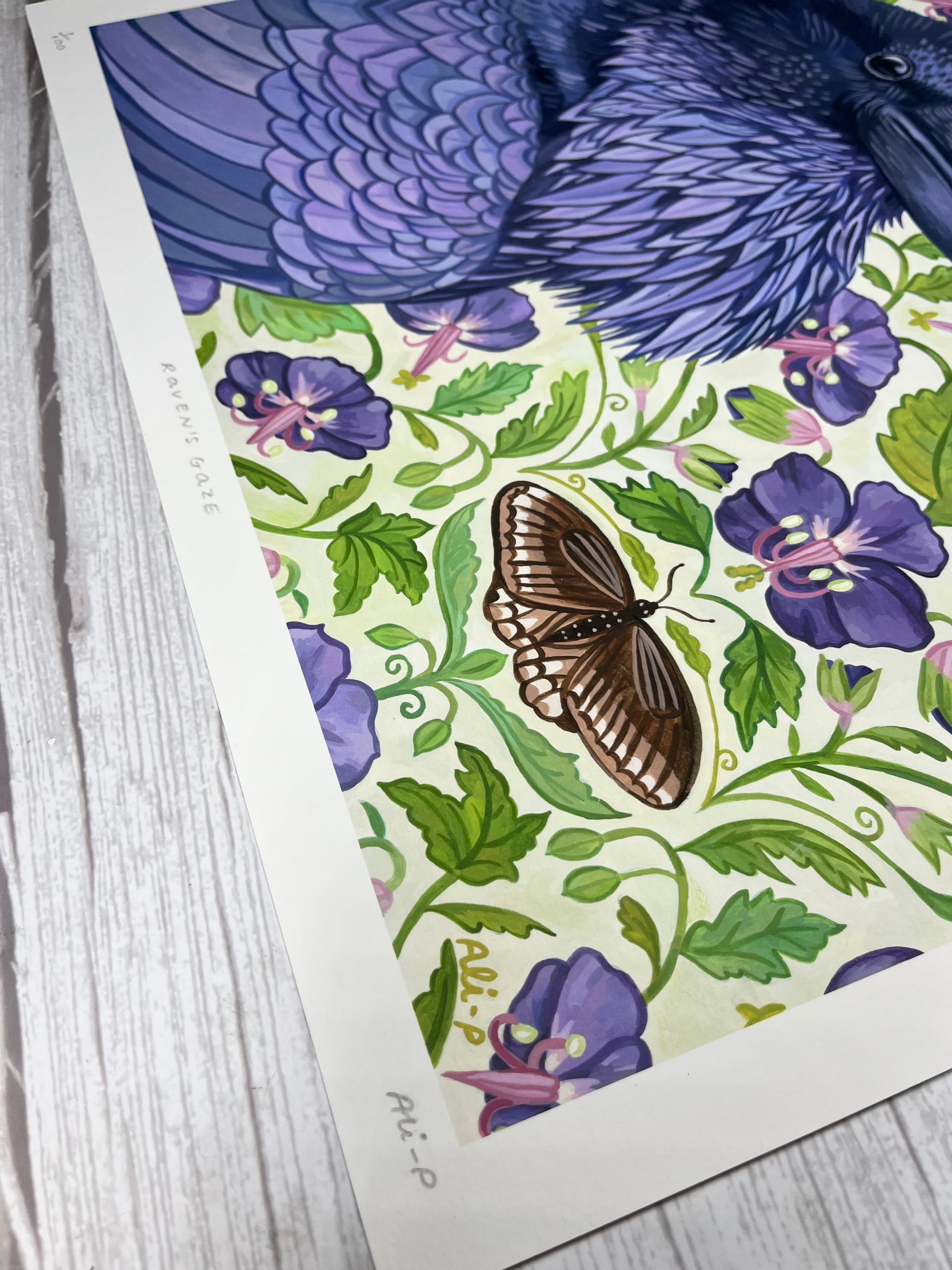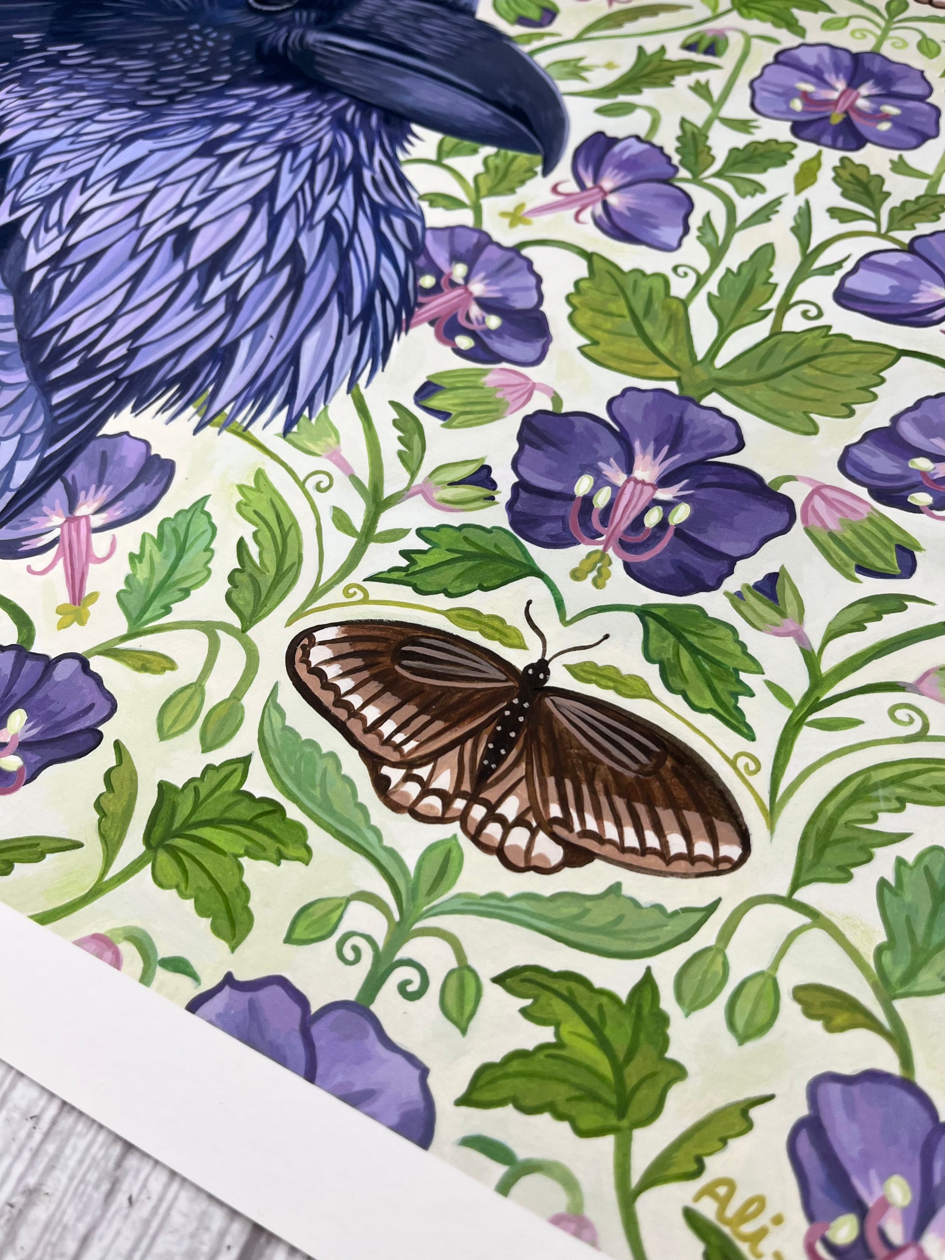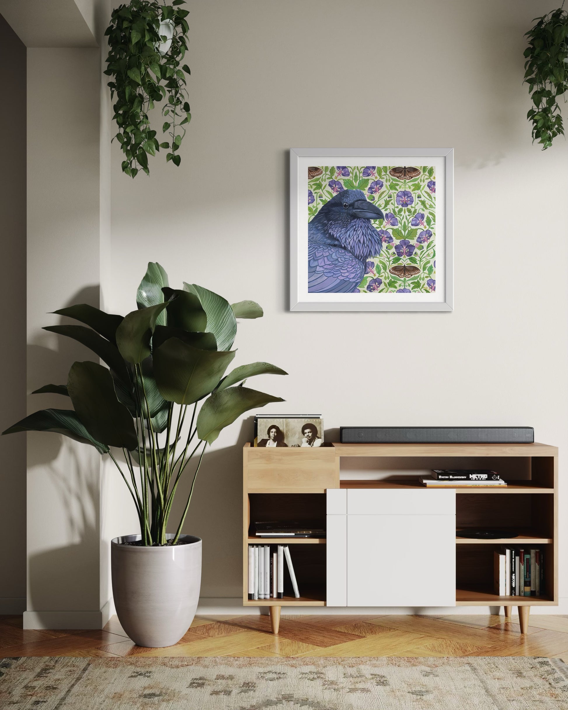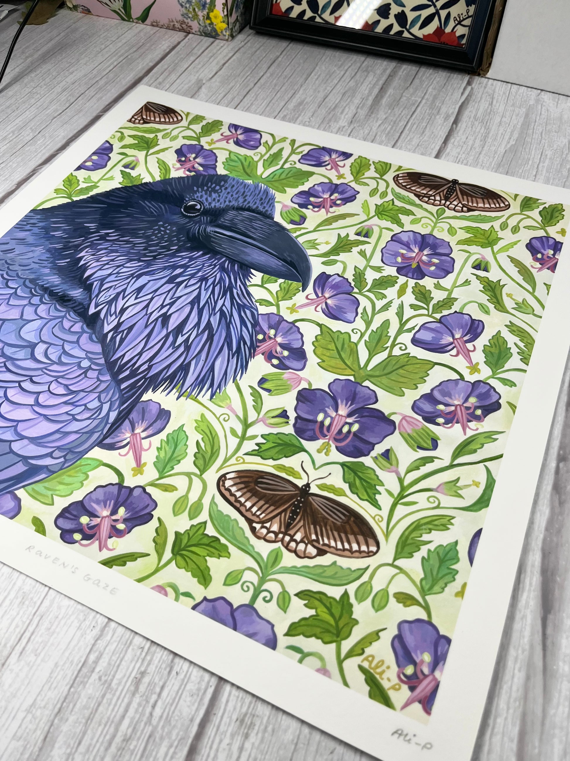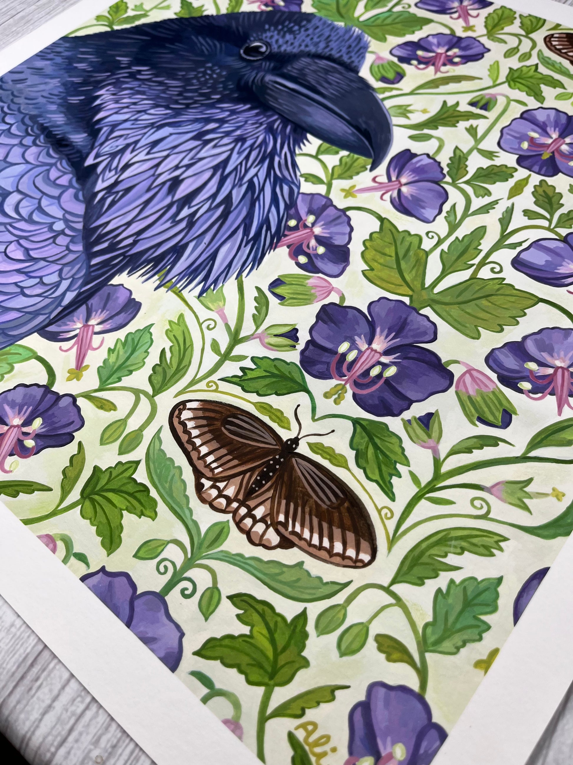 Raven’s Gaze is inspired by Ali's love of nature and wildlife of Northern Ireland, and also her admiration for corvids—intelligent, curious birds with striking personalities. This piece features a detailed raven in rich shades of purple and blue, set against a patterned backdrop of geraniums and ‘Raven’ butterflies. The repeating floral design reflects Ali's love of pattern, creating a tapestry-like feel that complements the raven’s bold presence.