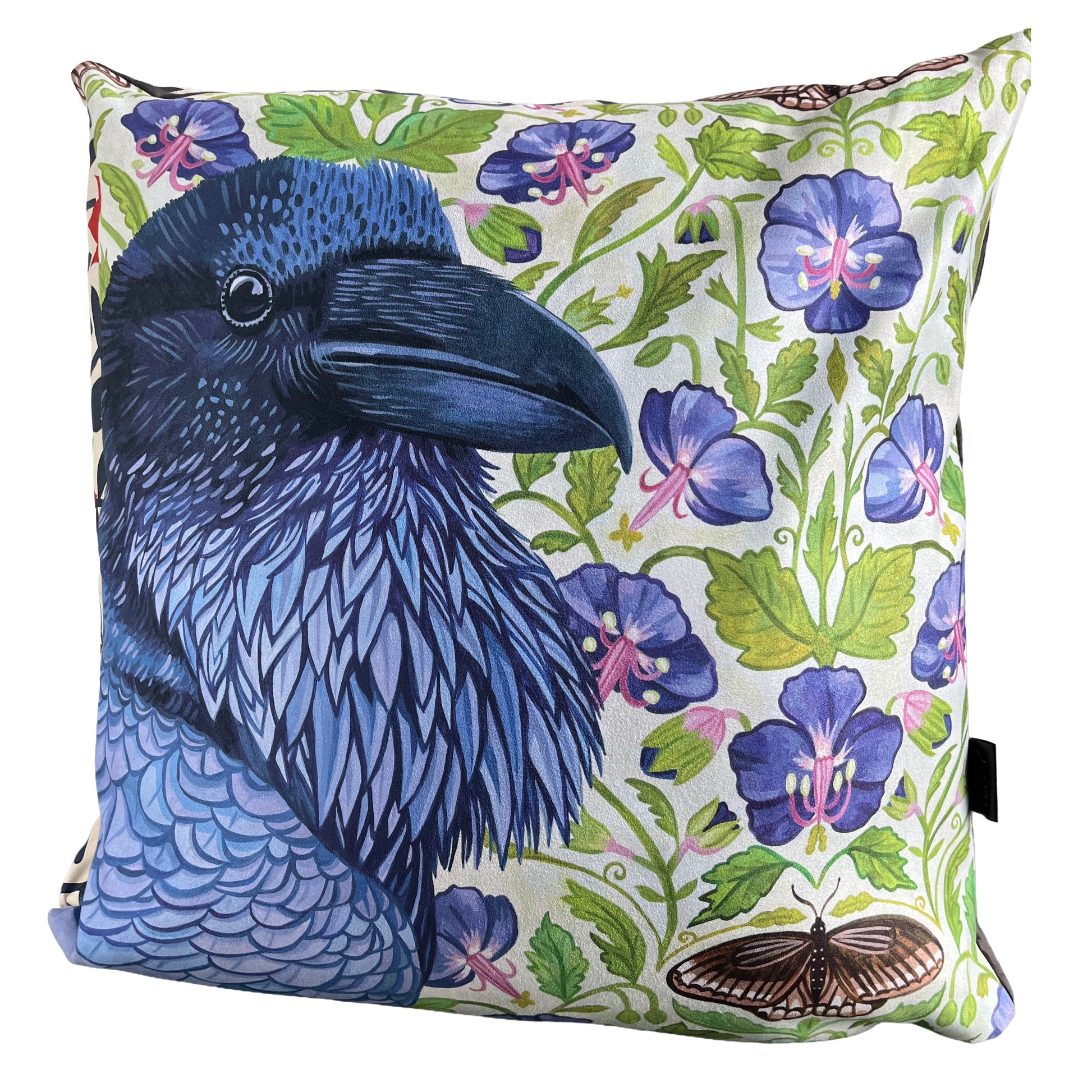 Raven’s Gaze is inspired by Ali's love of nature and wildlife of Northern Ireland, and also her admiration for corvids—intelligent, curious birds with striking personalities. This cushion cover features a detailed raven in rich shades of purple and blue, set against a patterned backdrop of geraniums and ‘Raven’ butterflies. The repeating floral design reflects her love of pattern, creating a tapestry-like feel that complements the raven’s bold presence.