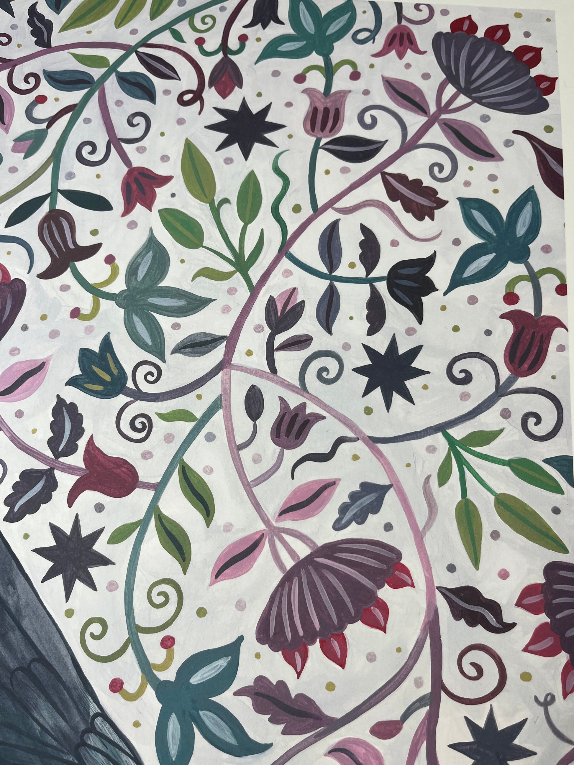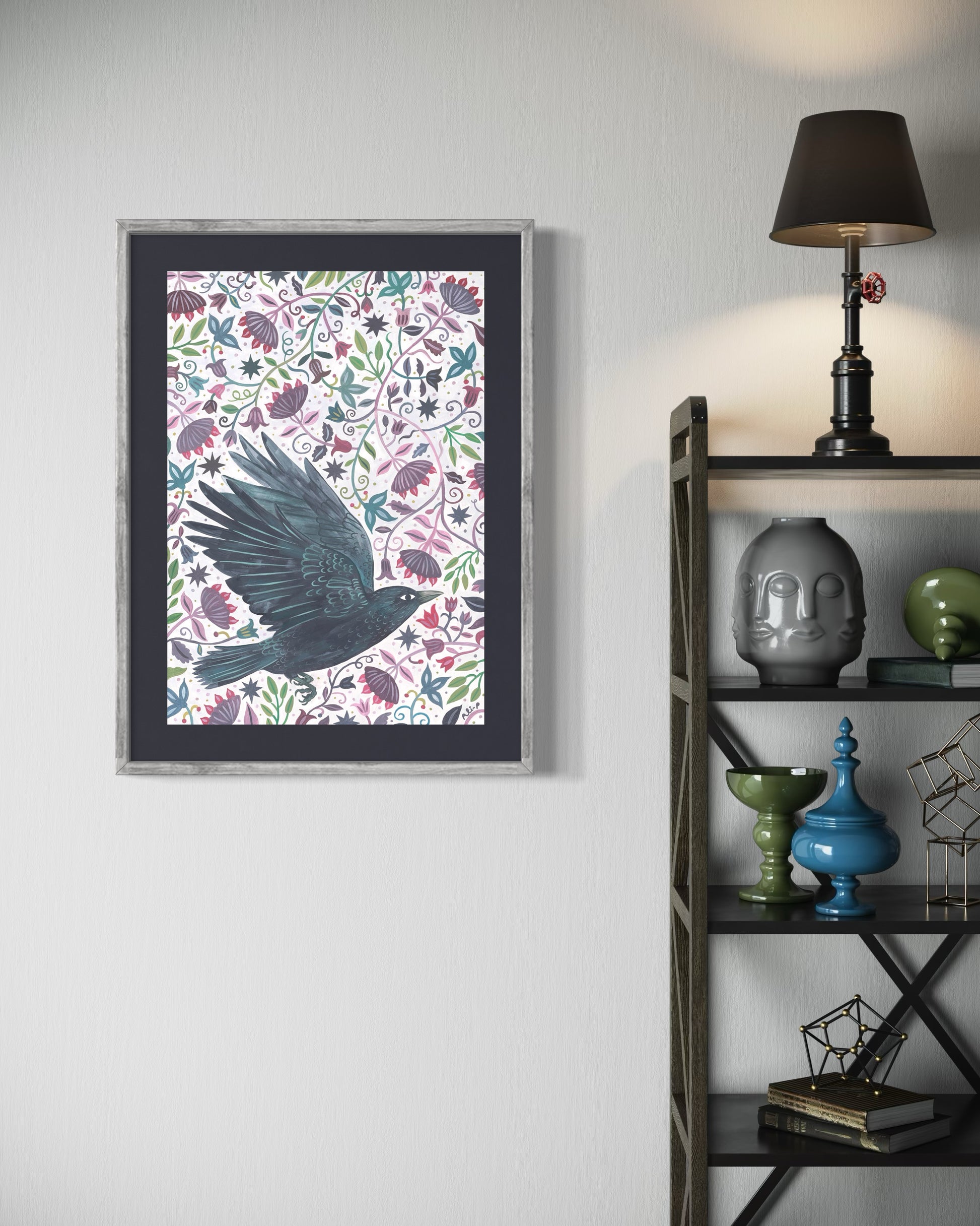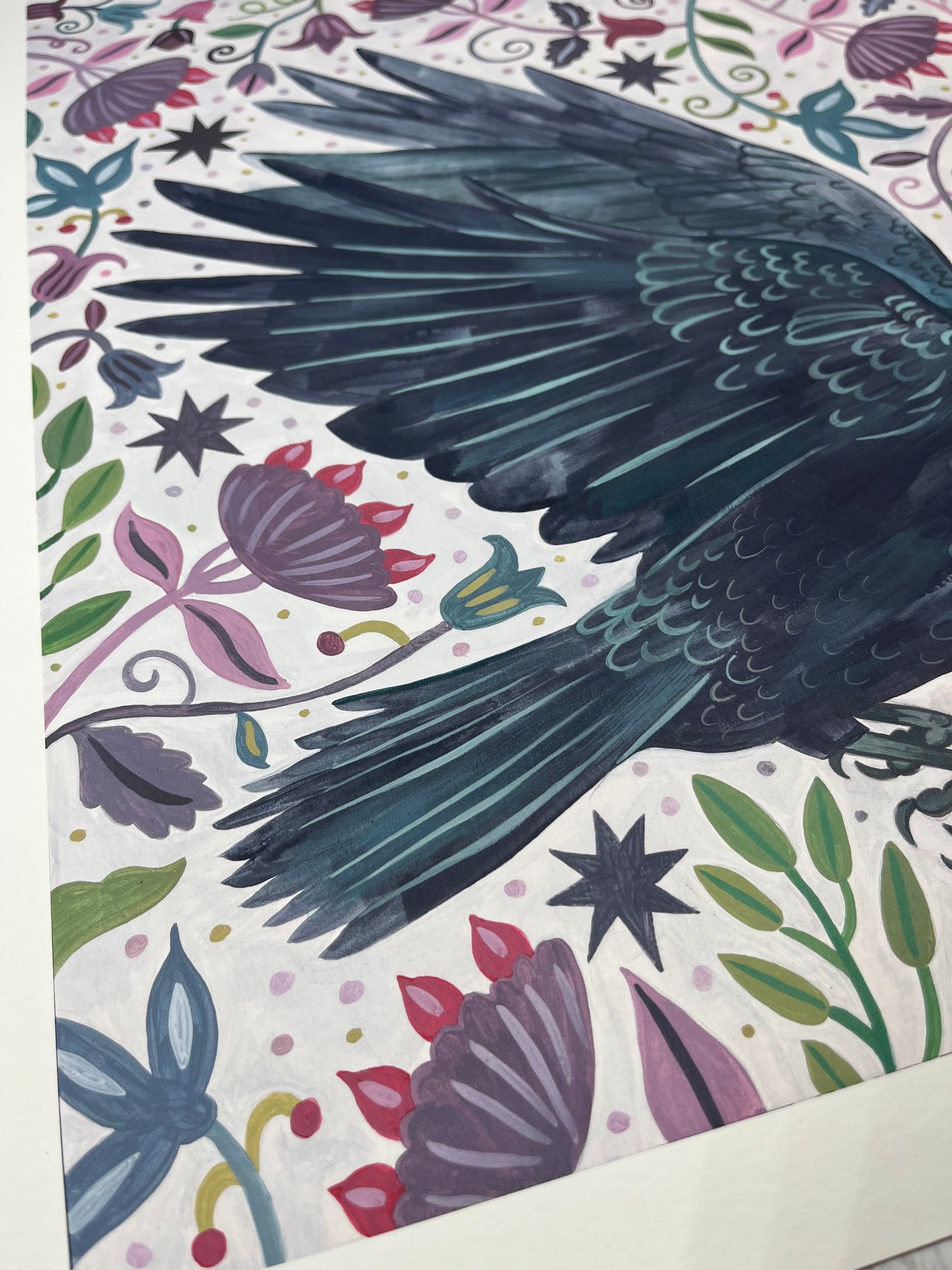 The Raven Rises is inspired by Ali's love of corvids—clever, curious birds that are full of character. The background is filled with winding flowers and leaves, reflecting her love of pattern and creating a tapestry-like feel that brings movement and life to the scene.