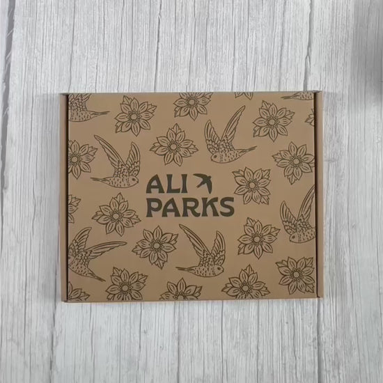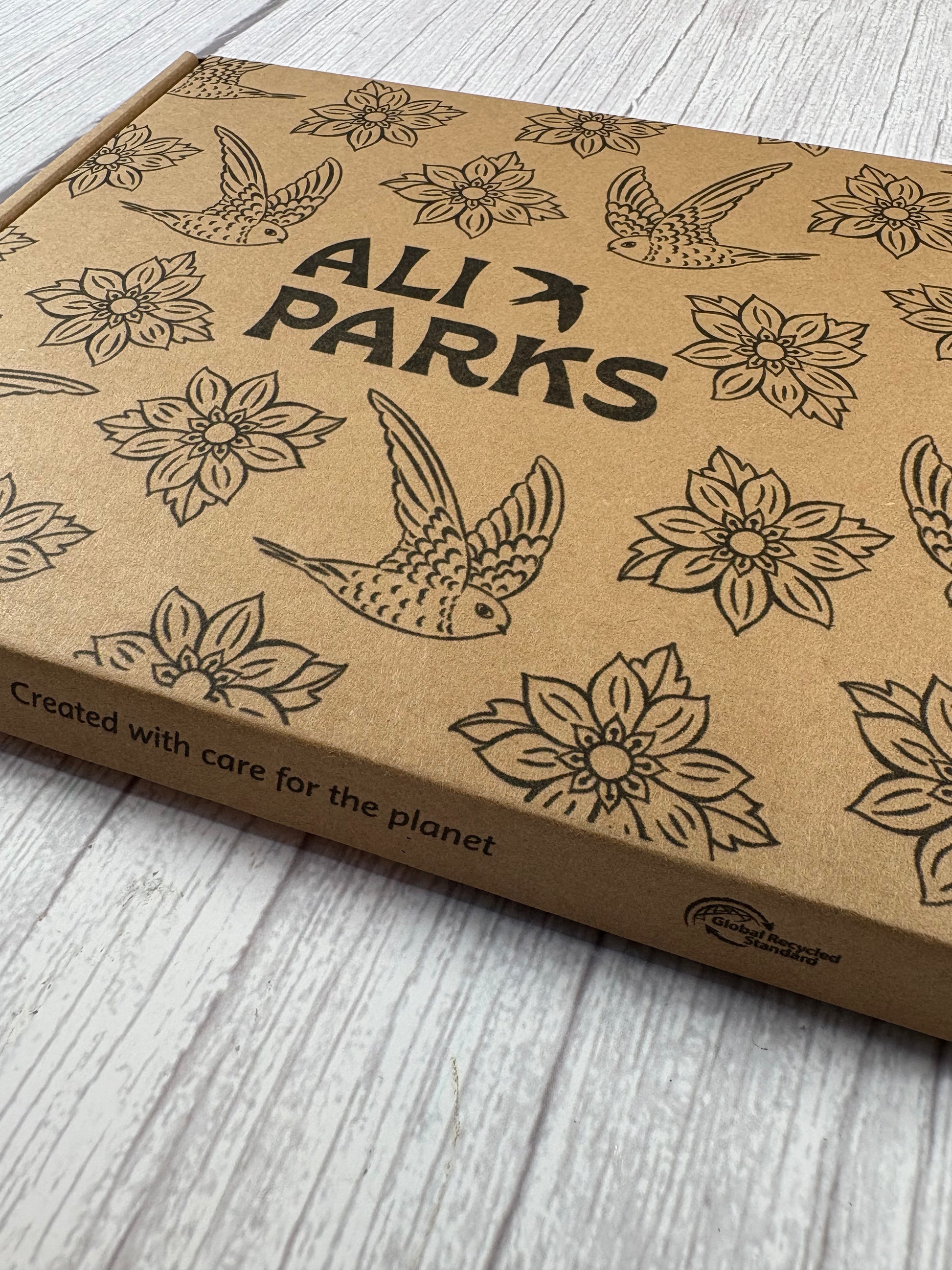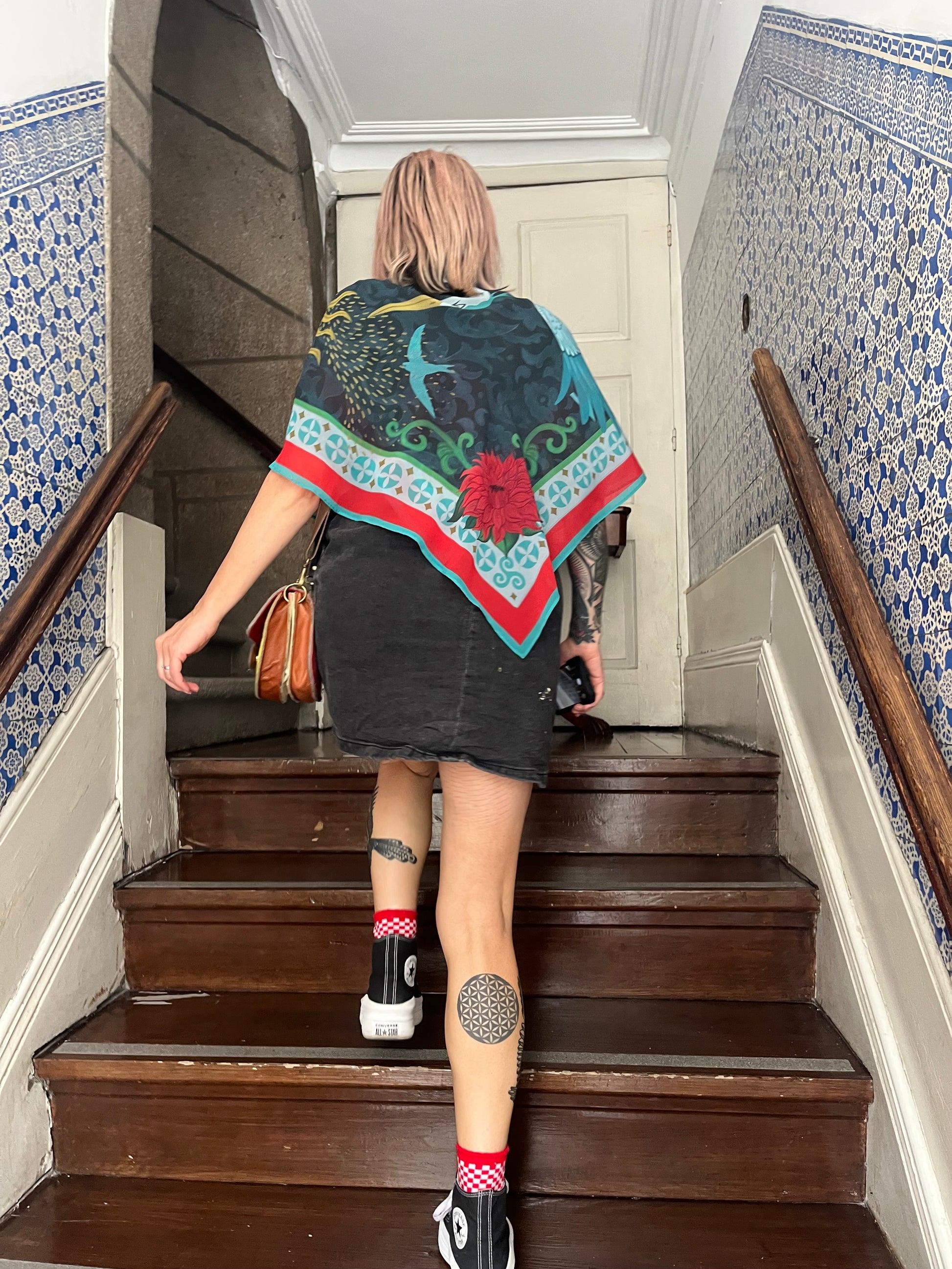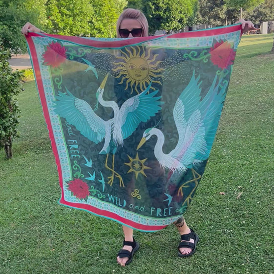 This limited edition scarf features two great herons dancing beneath the sun, a celebration of freedom, rhythm, and connection to the natural world. Ali has also added swifts flying to honour these remarkable and now endangered birds, known for their grace, speed, and resilience. A vintage compass completes the design, symbolising protection, hope, and guidance.