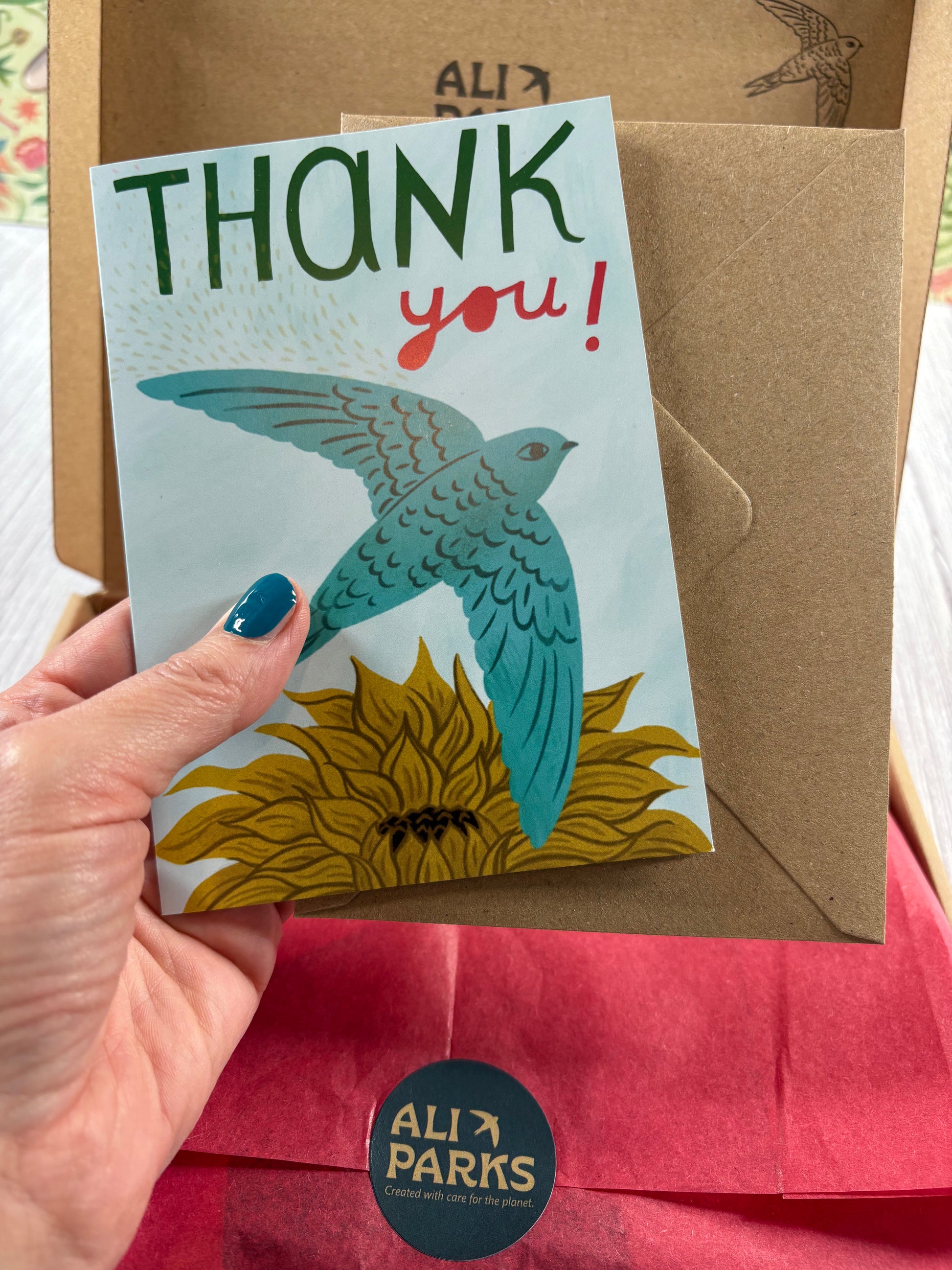 Features herons, swifts, the sun, and a vintage compass Words “wild and free” woven into the design